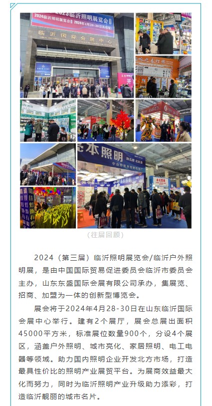 2024(第三届)临沂照明展览会/临沂户外照明展将于4月28-30日在临沂国际会展中心举办。本届展会建有2个展厅,展会总展出面积约45000平方米,分设4个展区,涵盖户外照明、城市亮化、家居照明、电工电器等领域。为照明灯具产业链上下游企业提供一个集新品展示、交流对话、招商加盟等高效合作的多方共赢平台!
